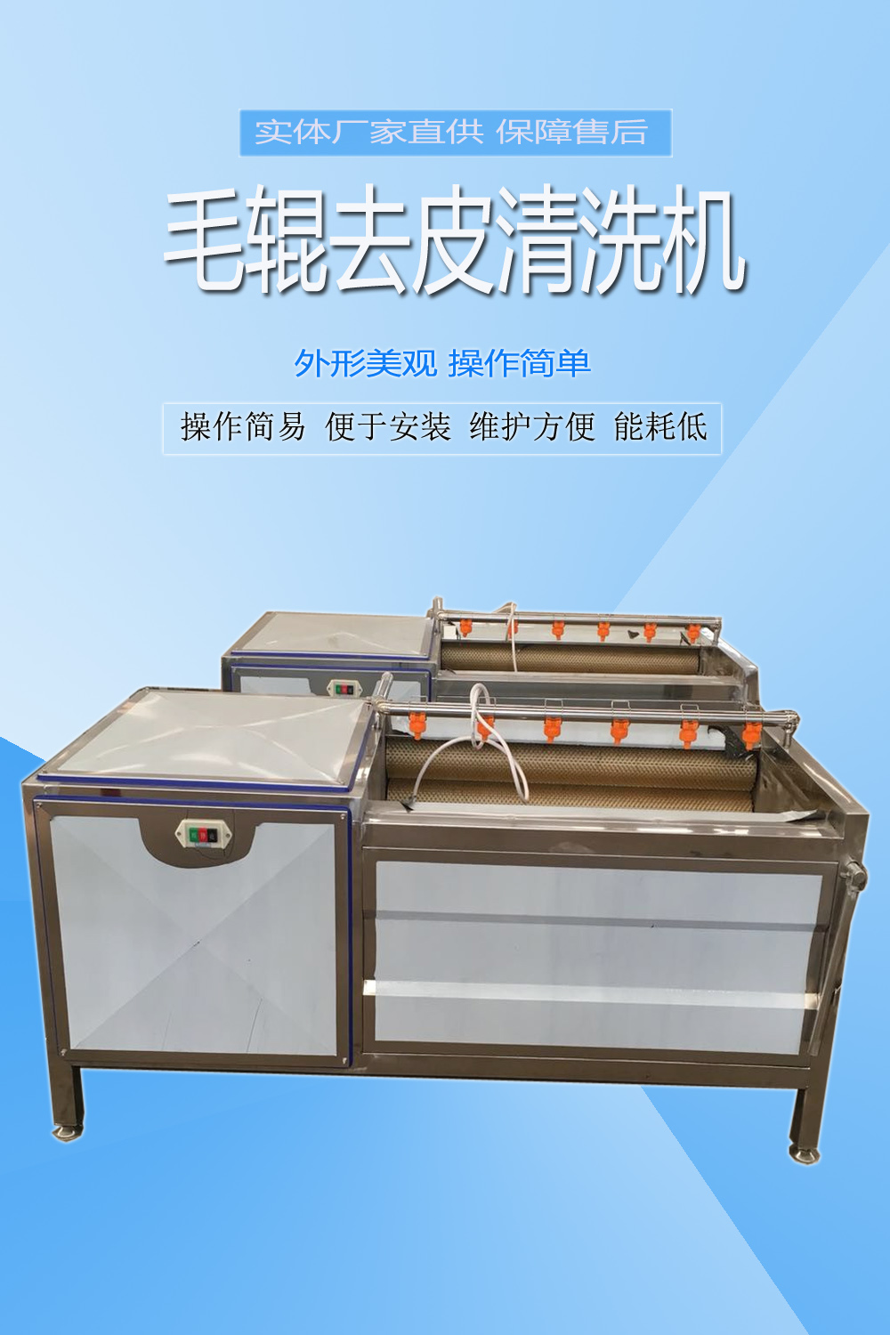 ?瓜果毛輥清洗脫皮機具有外形美觀和操作方便,清洗脫皮容積大、效率高,耗能小,可連續