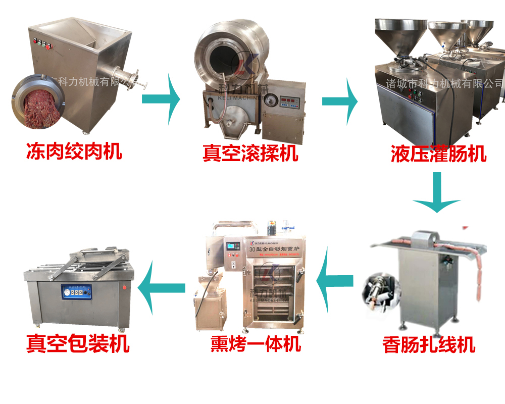 凍肉絞肉機廣泛應用于肉制品加工中,上圖為香腸加工線。