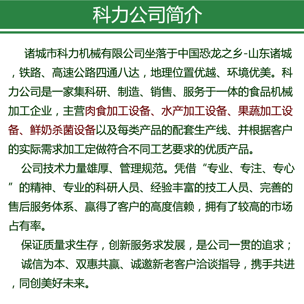 諸城市科力機械有限公司 銷售電話:0536-6519718 公司郵箱:郵箱: zckljx@163.com 地址:諸城市密州街道觀海路3500號